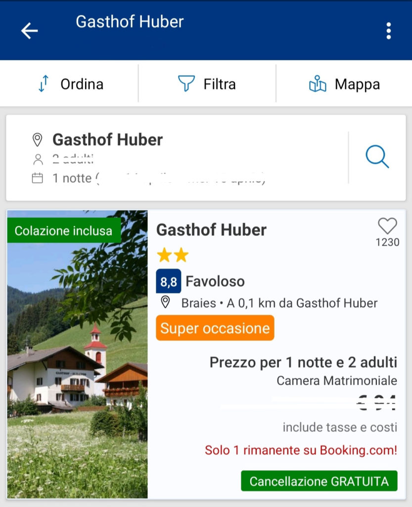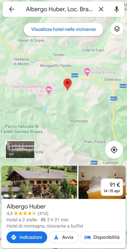 La soluzione ideale arrivò quando cominciai a cercare con Booking stanze d’hotel nelle vicinanze di Dobbiaco; c’erano molti paesini con prezzi inferiori, ma ad attirare la mia attenzione fu un hotel a quindici minuti dalla nostra meta: Gasthof Huber, Braies. 99 € per una notte, stanza matrimoniale con colazione compresa. Mai scelta migliore fu presa, senza contare che ci sarebbe stata una seconda meta da visitare!
